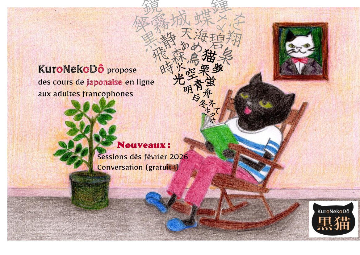 ようこそ黒猫堂へ Chez KuroNekoDô, nous offrons des cours de japonais adaptés à tous les niveaux, alliant rigueur et plaisir d'apprendre. Votre enseignante expérimentée est là pour vous guider et vous immerger dans la langue et la culture japonaises. Vous découvrirez des aspects variés de la civilisation nippone à travers des leçons interactives et dynamiques. Rejoignez-nous et laissez-vous emporter par la passion du Japon chez KuroNekoDô, votre centre de référence pour les cours de japonais pour adultes francophones curieux et motivés.